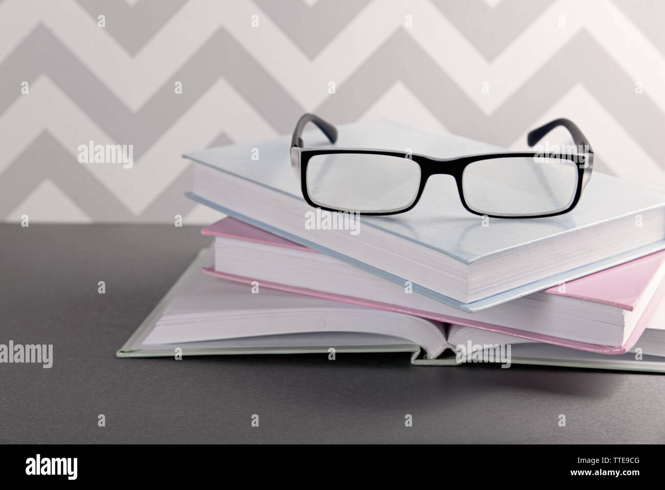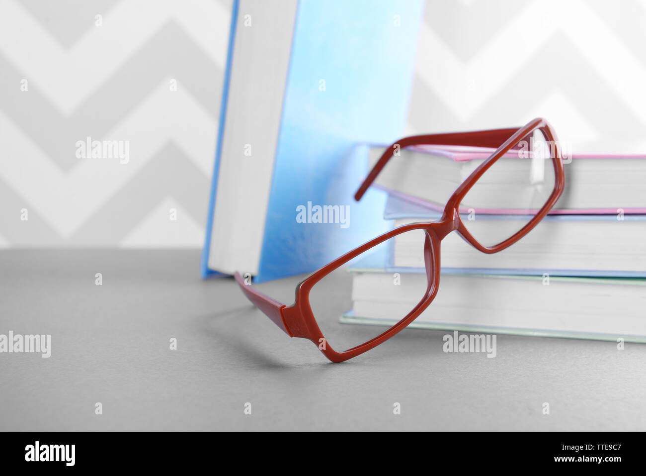 on grey table against ornament wall eyeglasses ornament