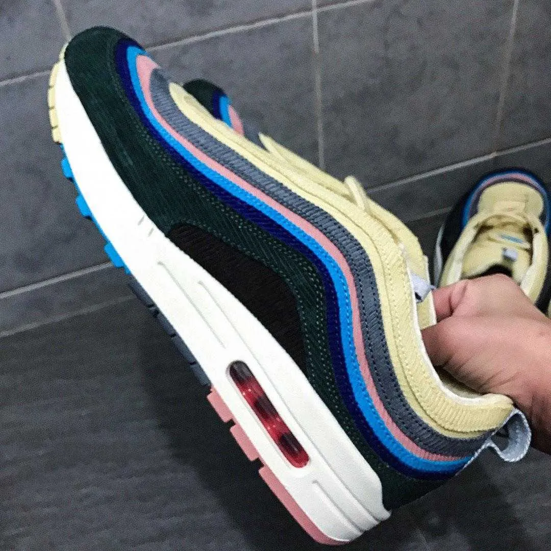 2020 Air SW 97 Sean Wotherspoon Designer Shoes 97s Vivid Sulfur Multi Yellow Blue Hybrid Running sean wotherspoon dhgate